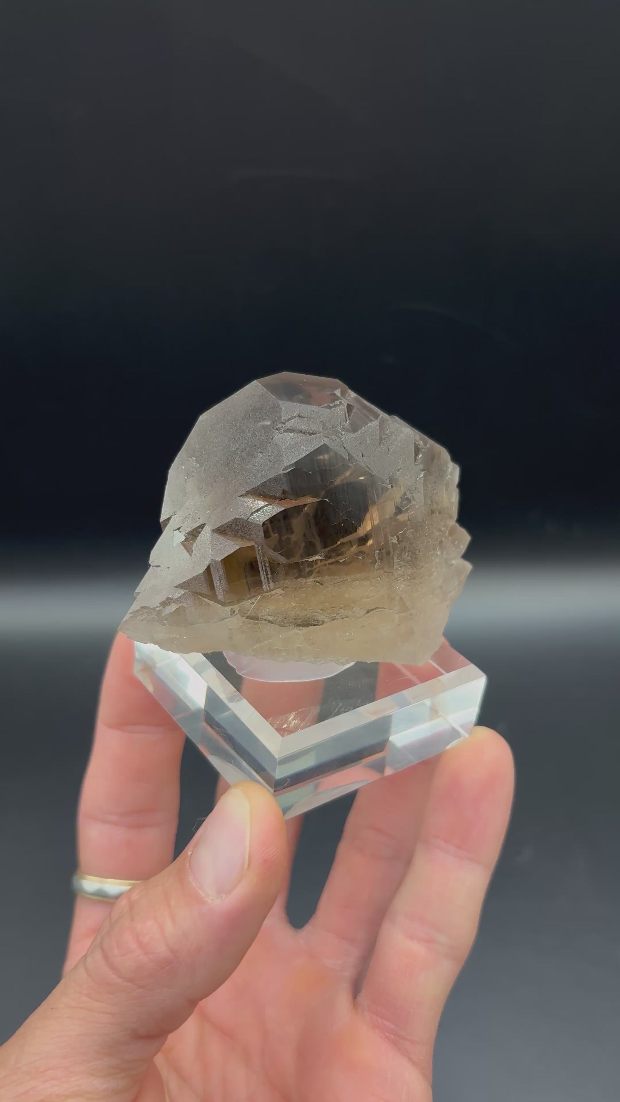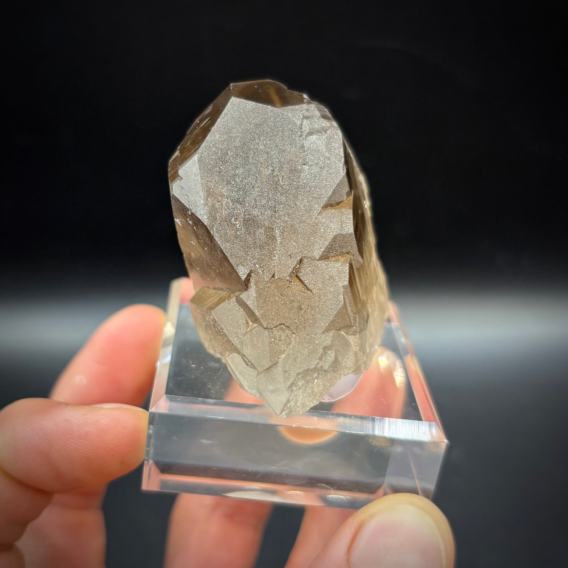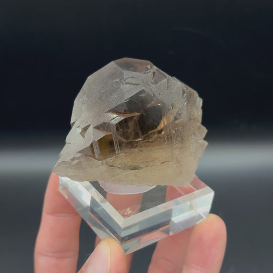 A beautiful thick doubly terminated smoky quartz Gwindel specimen with a slight twist. No contact or damage. Clean terminations. 2025 production. Gem clarity within. Displays well, front or back. Printed mineral label included.